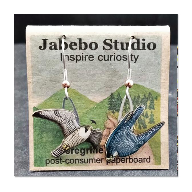 Our Jabebo Peregrine Falcon Earrings depict this large falcon in it’s famous stoop  posture that can reach speeds of 200 MPH! More common in western North America though they are making a come back in the east. Northern birds also use the east coast as a migration corridor.